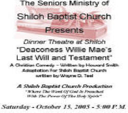 "My Brother, My Sister, Forever " About The Production * The Writer\Director * The Cast Bio's * Production Photos Production Photos "A Visitor's Blessing" * "We Praise Your Name" * "Deaconess Willie Mae" * "Senior Moments" |