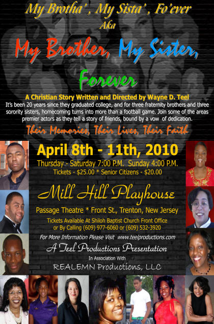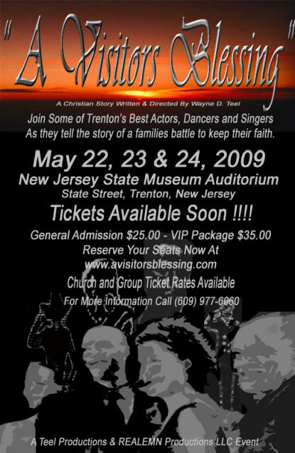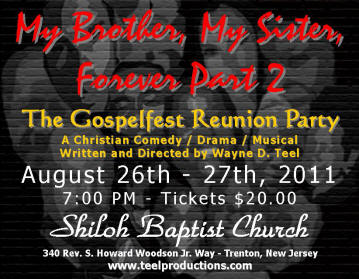 Teel Productions – was established in 1997, by Wayne Teel, to produce a weekly community based, public access, TV program, “In The Spirit”. The program ran for 12 years before it was transitioned into a weekly sermon series program for Shiloh Baptist Church. In 2005 Wayne began producing and directing the plays that he wrote as dinner theatre for some of the ministries of the Shiloh Baptist Church. “We Praise Your Name”, “Senior Moments” and “Deaconess Willie Mae’s Last Will and Testament” were performed at Shiloh to sold out audiences. Attendance required encore performances for all of the productions. Since the Christian Based productions were well received, it was determined that Teel Productions expand its outreach through performing arts ministry. Teel Productions includes actors, singers, dancers and production support staff from the greater Trenton area and beyond. Our mission is to promote the performing arts by writing, producing and supporting stage productions. "A Visitor's Blessing" was performed in May 2009 at the New Jersey State Museum with an encore performance in July 2009 at the Shiloh Baptist Church. "My Brother, My Sister, Forever" was performed April 8th thru the 11th, 2010 at the Passage Theatre in Trenton, New Jersey. "My Brother, My Sister, Forever - Part 2 - The Gospelfest Reunion Party" had two successful runs during 2011. "Take Your Hat Off In The Sanctuary" was performed in 2014 At Shiloh with an encore presentation in February 2020. Click Here To View Production Videos On The Teel Productions Youtube Channel |